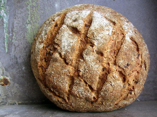 Usual procedure: mix all the ingredients, short knead method, ferment four hours or overnight in the fridge. Shape, three and a half hours prove. Bake 50 minutes at 210C.