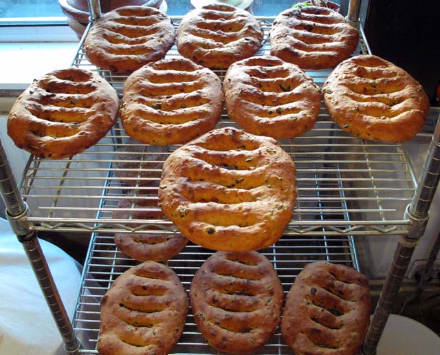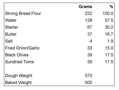 Prepping: gently fry the onions and garlic in a generous amount of olive oil and cool completely. Soak the sundried tomatoes, drain well, leave in largish pieces. If the olives are in brine you might want to soak them in advance. Don’t chop too small.