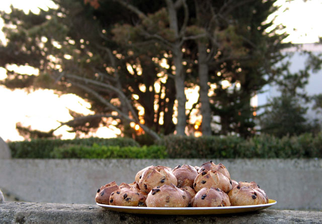 These have their origins in a yeasted recipe from Martha Rose Shulman’s “The Bread Book”. They are nothing like woolly supermarket buns with piped crosses. A percentage of wholemeal flour gives them body, made zingy with Elizabeth David’s spice mix, and taken to another level by the sweet/sour honey/lemon glaze.