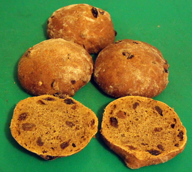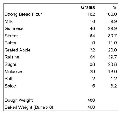 This is adapted from Meera Sodha’s recipe in the Guardian newspaper. The original was a commercially yeasted vegan recipe that needed rescuing. Here it is a naturally leavened, seriously spicy Easter Bun recipe that has a wonderful sort of chewy toffee taste and texture from the use of grated apple, molasses and stout.