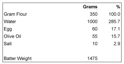 Whisk the olive oil and egg briefly in a blender. Add the salt and half the water and blend. Add half the flour and blend again. Add the remaining flour and pour in the remaining water while the blender is running. Pour the mixture through a sieve. Stand for at least half a day or for up to two days in the fridge. The batter will seem impossibly thin – do not panic!
