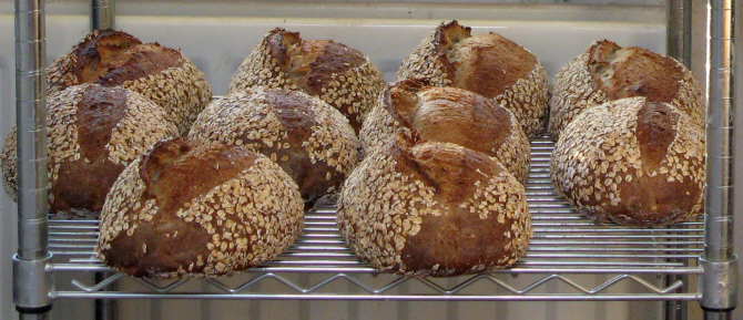 After the dough has been shaped it needs to be coated in additional oats. Place two trays side by side. Cover one tray with a wet tea towel and the other with a generous layer of oats. Roll the shaped dough on the tea towel and then in the oats so that it is completely covered. Place it in the couche seam side up. Cover and leave for 3½-4 hours checking with the finger tip test after 3 hours.