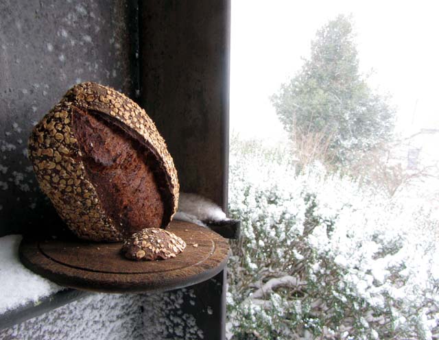 Can’t remember the origins of this bread. I think someone posted a yeasted version on the Bread Bakers Guild of America forum in response to a request from another baker. I know it took some serious input to adapt it to natural leavening and adjusting the proportions so it worked for me. It was well worth the effort.