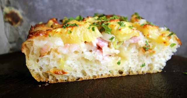 I’m sure a lot of people would say this is not authentic focaccia but I’ve never been interested in authenticity. One of the great things about sourdough is you can develop it in your own style, mould it to suit yourself and your requirements, put your own stamp on it. When you bake for customers you need uniformity, to be as efficient as possible so that your orders are ready when the customers are due and produced in a way that does the least damage to the baker. These focacce were developed within these parameters. The size and weight are determined by the size of the pizza tins and this weight allows them to prove on the tins in two hours (after bulk overnight fermentation in the fridge, one hour of proving, add the toppings and press out the dough to its full extent + second hour of proving) as opposed to 3.5 hours for loaves. They also bake in about 25 minutes as opposed to 50 minutes for the loaves. This all means they can be slotted into odd but convenient times in the baking day. Then there is the rather important consideration that they sell for a good price!