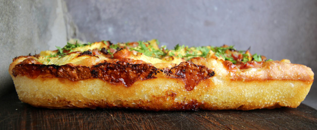 The other main feature of Detroit style is the frico. The first half of the cheese goes in the dough. The second half goes on with the topping with a big emphasis on the edges for that it browns and goes crisp against the tin forming the frico. Got it half right in the photo above!