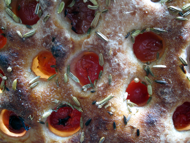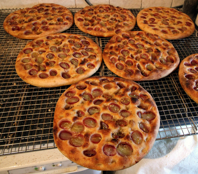 Preheat the oven to 250C. Oil your hands and press the grapes into the dough with the flat of your hands. With oiled fingers dimple the dough to stop it ballooning in the heat of the oven. Sprinkle the dough with a good scattering of fennel seed and a little sugar. Bake for 20-25 minutes reducing the temperature to 200C after 10 minutes.