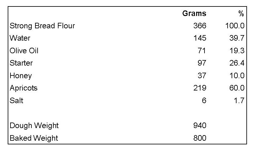 This is a formula I put together several years ago in celebration of the feast day of Santes Dwynwen, Welsh patron saint of lovers (25 January). In the past I have substituted a bit of einkorn for a portion of the bread flour, and soaked the apricots in a little Welsh mead to create a sort of false “authenticity”. But I prefer it as presented here.